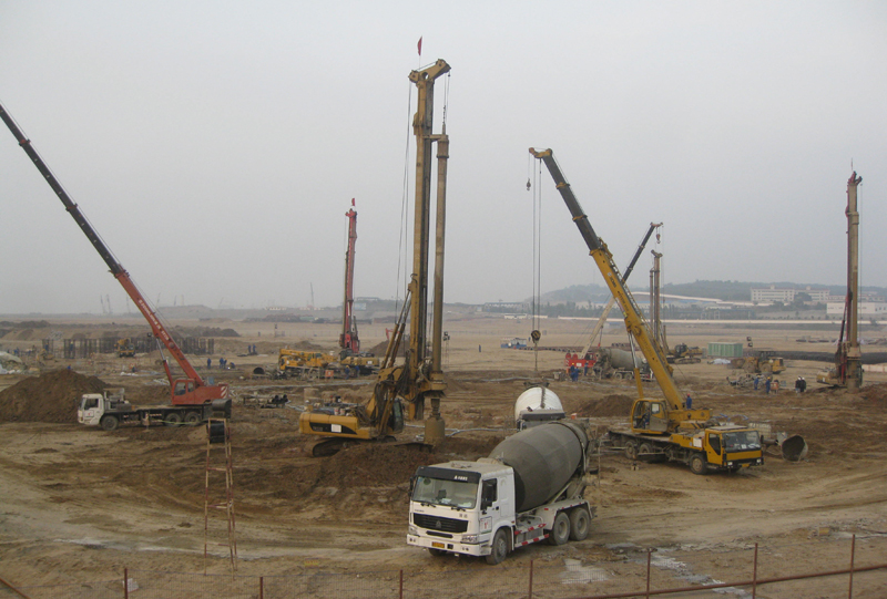 本工程共投入4臺旋挖鉆機、2套攪拌站及其它配套施工機械設備,共完成樁徑1.2m、樁長33.5m鉆孔灌注樁856根,完成直徑1.2m、柱高3m柱子856根;總理論混凝土量35000余方。本工程于2011年11月15日正式開工,其中1#罐樁基于2012年1月9日完工;2#罐樁基于2012年2月14日完工;1#罐柱子施工于2012年1月13日開始,3月14日完成混凝土澆筑工作,4月8日移交;2#罐柱子施工于2012年2月17日開始,3月30日完成混凝土澆筑工作,4月21日移交,工期提前1個月。