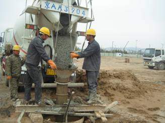 本工程原設計為干孔旋挖鉆孔灌注樁,試樁階段發(fā)現(xiàn)場地地表以下10米到14米位置存在大面積不確定位置的上層滯水,導致嚴重塌孔,經設計院同意,改為泥漿護壁成孔水下旋挖鉆孔灌注樁并采用樁端后注漿工藝。施工內容主要包括:測量放線、鋼筋籠制作、鋼筋籠運輸與吊裝、成孔、水下混凝土灌注、后注漿、渣土清運等。我公司共完成灌注樁共1026根,設計混凝土方量為7225.4m3,實際灌注方量8576.3m3,平均充盈系數(shù)1.187。試樁樁身混凝土強度等級為C40,工程樁樁身砼強度等級為C30。