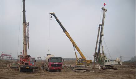 本工程樁基采用后壓漿旋挖鉆孔灌注樁,完成了高效沉降槽、種子過濾、1#、2#、3#、4#焙燒爐、電除塵、平盤過濾、預(yù)脫硅槽、高位槽、種子分解、1#、2#、3#、4#冷卻塔、1#、2#、3#鋁粉倉(cāng)、棧橋、堿液調(diào)配、提升機(jī)、礦漿槽和蒸發(fā)器、礦漿槽、蒸發(fā)器、冷卻塔、堿液調(diào)配、預(yù)脫硅槽、高位槽。施工主要內(nèi)容包括:測(cè)量放線、鋼筋籠制作、運(yùn)輸與吊裝、成孔、混凝土攪拌與運(yùn)輸、水下混凝土灌注、后壓漿、渣土清運(yùn)等。共完成直徑1000mm、800mm和600mm的灌注樁共4501根,樁身混凝土為C25和C30兩種,混凝土設(shè)計(jì)方量81773.8m3,實(shí)際灌注方量95288.0m3,平均充盈系數(shù)1.17。