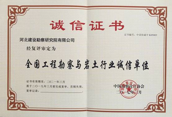 根據(jù)中國勘察設(shè)計協(xié)會5月15日發(fā)布的中設(shè)協(xié)字[2017]29號文件《關(guān)于公布工程勘察與巖土行業(yè)第一批第二批“誠信單位”復(fù)評、復(fù)審結(jié)果的通知》,我公司作為第一批271家“誠信單位”之一,通過復(fù)評審核,被審定為全國工程勘察與巖土行業(yè)誠信單位,并于近日領(lǐng)取了誠信證書。
