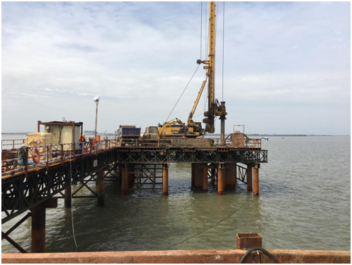 本工程于2017年3月份開始施工,截止到2018年3月,共計完成了直徑1200mm混凝土灌注樁36根,樁長38.0m~44.0m;直徑1500mm混凝土灌注樁297根,樁長38.0m~59.0m。目前已完成的混凝土方量為33567m³,高峰期時投入旋挖360鉆機2臺套,空壓機2臺,鏟車1臺,泥漿船1臺。