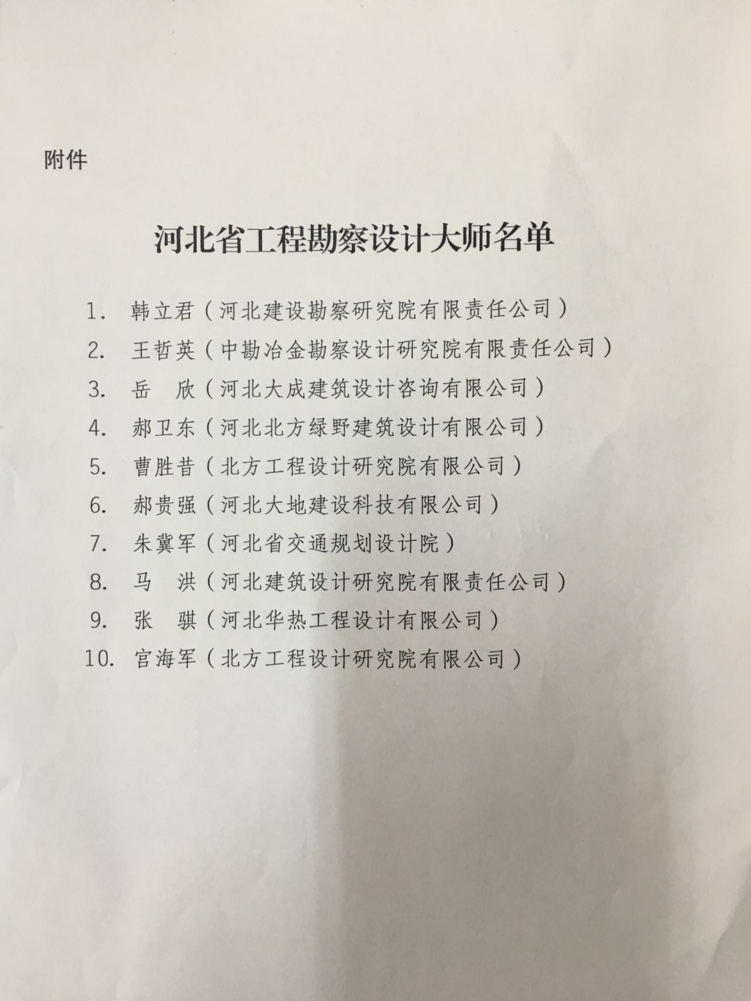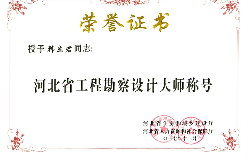 近日,從河北省住房和城鄉(xiāng)建設(shè)廳、河北省人力資源和社會(huì)保護(hù)廳聯(lián)合印發(fā)的《關(guān)于認(rèn)定河北省工程勘察設(shè)計(jì)大師的決定》獲悉,公司董事長韓立君榮獲“河北省工程勘察設(shè)計(jì)大師”稱號(hào)。