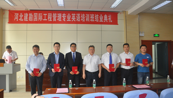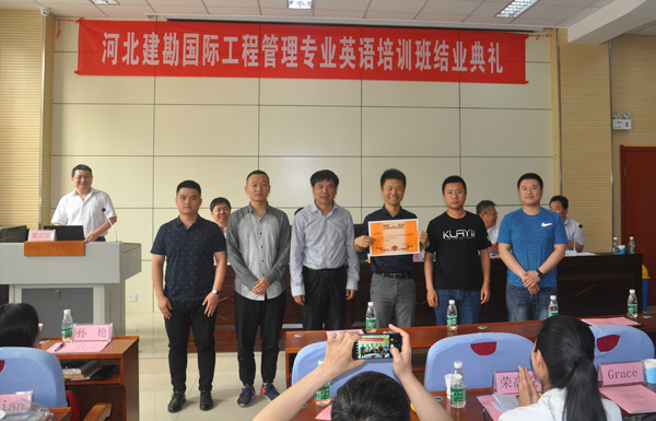 公司委托石家莊鐵道大學繼續(xù)教育學院舉辦的首屆國際工程管理專業(yè)英語培訓班(共29人,分6組),經(jīng)過28天的緊張培訓,已經(jīng)完成全部課程的學習。2018年5月14日下午,石家莊鐵道大學第九實驗室103教室,書聲瑯瑯,掌聲雷鳴,公司首屆國際工程管理專業(yè)英語培訓班結(jié)業(yè)典禮在這里舉行,出席結(jié)業(yè)典禮的有:公司總經(jīng)理李華偉、總工程師聶慶科、人力資源部主任張軍旗及全體學員;石家莊鐵道大學副校長陳進杰、繼續(xù)教育學院院長王書海、繼續(xù)教育學院副院長楊杰、外語系黨支部書記林治華、外語系副主任李玉潔、培訓班班主任孫艷以及教師和助教。