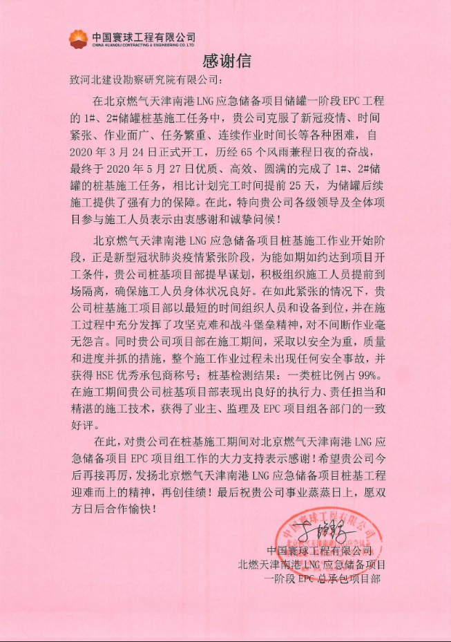 由我公司承建的北京燃?xì)馓旖蚰细跮NG應(yīng)急儲備項(xiàng)目1#、2#儲罐樁基工程,自2020年3月24日正式開工,歷經(jīng)65個日夜的奮戰(zhàn),最終于2020年5月27日優(yōu)質(zhì)、高效、圓滿的完成了1#、2#儲罐的樁基施工任務(wù)。中國寰球工程有限公司北京燃?xì)馓旖蚰细跮NG應(yīng)急儲備項(xiàng)目儲罐一階段EPC項(xiàng)目組,對我公司北燃樁基項(xiàng)目組表示由衷的感謝,感謝我公司領(lǐng)導(dǎo)及全體項(xiàng)目施工人員的辛勤付出,在克服了新冠疫情、時間緊張、作業(yè)面廣、任務(wù)繁重、連續(xù)作業(yè)時間長等各種困難的情況下,奮勇向前,較原定工期提前25天完成施工任務(wù),為項(xiàng)目后續(xù)施工帶來了強(qiáng)有力的工期保障。同時對我公司在樁基施工期間對北京燃?xì)馓旖蚰细跮NG應(yīng)急儲備項(xiàng)目EPC項(xiàng)目組工作的大力支持表示感謝!希望我公司今后再接再厲,繼續(xù)發(fā)揚(yáng)迎難而上的精神,再創(chuàng)佳績!