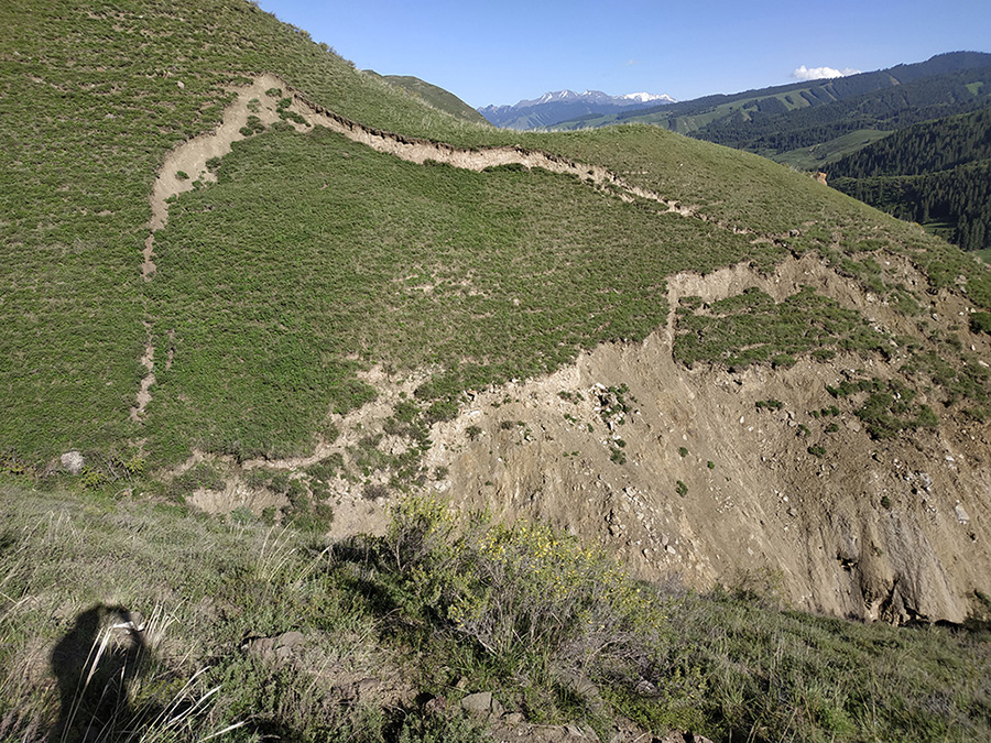山體滑坡:白楊溝豐源煤礦生產(chǎn)調(diào)度樓北側(cè)邊坡出現(xiàn)了滑坡,滑坡體表面巖土體松散,在降雨條件下有進一步發(fā)生滑坡的可能?;缕履_下有安全生產(chǎn)調(diào)度樓等建(構(gòu))筑物,如果再次發(fā)生滑坡,會危及生產(chǎn)調(diào)度樓及其周圍建筑物的人員生命和財產(chǎn)安全,因此需要對該滑坡進行勘查及治理,保證人員生命和財產(chǎn)安全。
