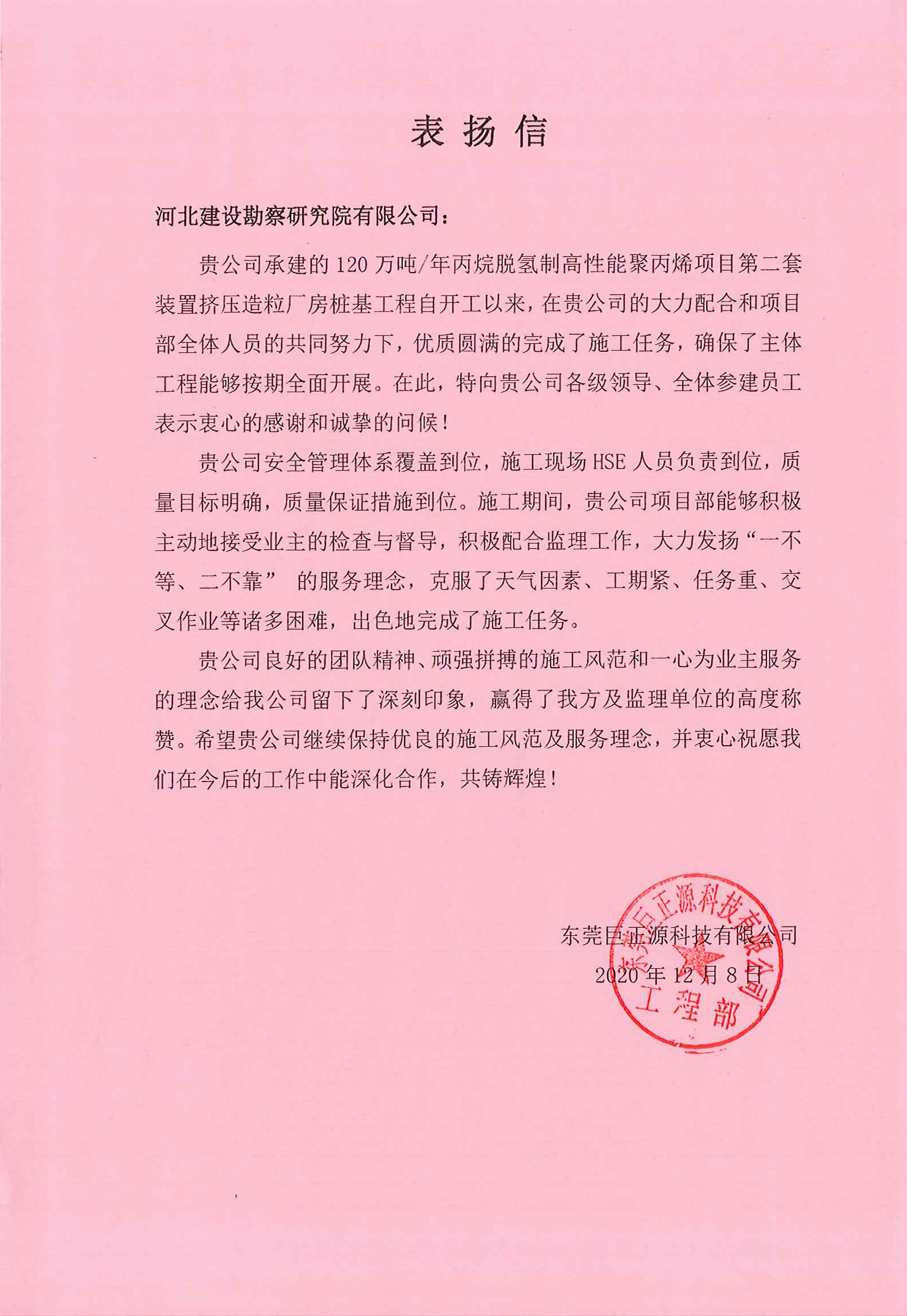 東莞巨正源120萬噸/年丙烷脫氫制高性能聚丙烯項目第二套裝置擠壓造粒廠房樁基工程自開工以來,安全管理體系覆蓋和質(zhì)量保證措施到位,大力發(fā)揚“一不等、二不靠”的服務理念,克服了工期緊、任務重、交叉作業(yè)等諸多困難,出色地完成了施工任務。特向公司各級領導、全體參建員工表示衷心的感謝和誠摯的問候!