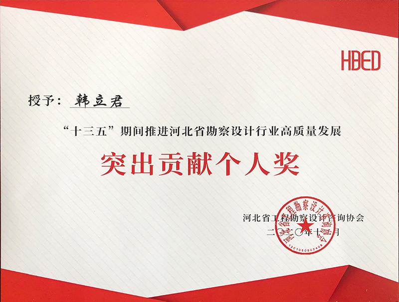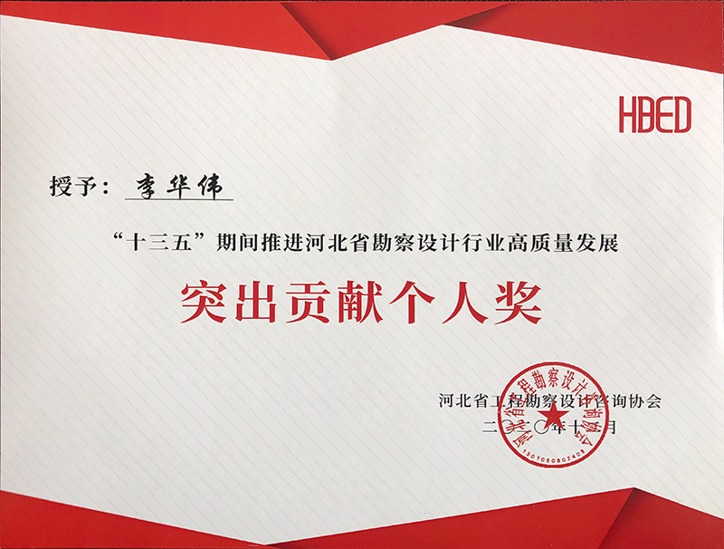 由河北省工程勘察設(shè)計(jì)咨詢協(xié)會評選,公司榮獲“十三五”期間推進(jìn)河北省勘察設(shè)計(jì)行業(yè)高質(zhì)量發(fā)展突出貢獻(xiàn)單位,韓立君董事長、李華偉總經(jīng)理、商衛(wèi)東主任榮獲“十三五”期間“推進(jìn)河北省勘察設(shè)計(jì)行業(yè)高質(zhì)量發(fā)展突出貢獻(xiàn)個人”。