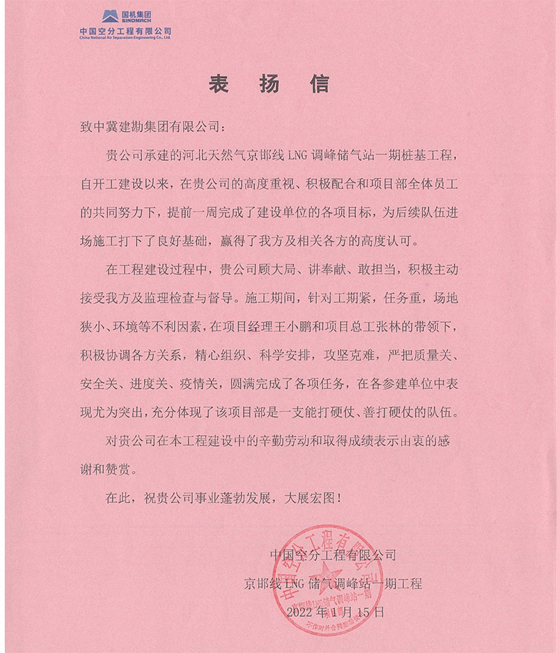 京邯線LNG儲(chǔ)氣調(diào)峰站一期項(xiàng)目樁基工程精心組織、科學(xué)安排、攻堅(jiān)克難,提前一周完工交付,為上部單位進(jìn)場(chǎng)施工打下良好基礎(chǔ),贏得了總包方及相關(guān)各方的高度認(rèn)可。
