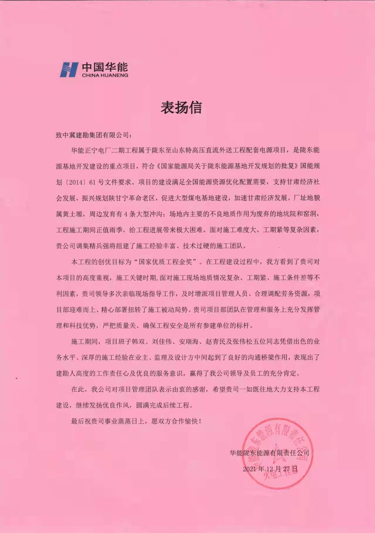 華能正寧電廠二期樁基工程屬于隴東至山東特高壓直流外送工程配套電源項目,是隴東能源基地開發(fā)建設的重點項目, 在工程建設過程中面對施工現(xiàn)場地質(zhì)情況復雜、工期緊、施工條件差等不利因素,項目部迎難而上、精心部署扭轉(zhuǎn)了施工被動局勢。在管理和服務上充分發(fā)揮管理和科技優(yōu)勢,嚴把質(zhì)量關、確保工程安全是所有參建單位的標桿。其中項目部班子韓雙、劉佳偉、趙青民、安瑞海及張偉松五位同志憑借出色的業(yè)務水平、深厚的施工經(jīng)驗在業(yè)主、監(jiān)理及設計方中間起到了良好的溝通橋梁作用,表現(xiàn)出了建勘人高度的工作責任心及優(yōu)良的服務意識,收到業(yè)主及監(jiān)理的高度贊揚。