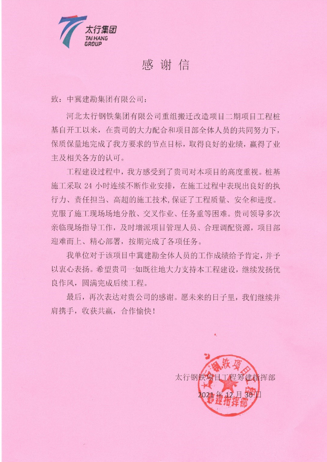 河北太行鋼鐵集團有限公司重組搬遷改造項目二期項目樁基工程位于河北武安工業(yè)園區(qū)南洺河工業(yè)園。本項目包括焦電聯(lián)產(chǎn)、二期發(fā)電、洗煤廠及二期1座高爐等附屬設施。施工期間迫于業(yè)主工期要求,不斷增加區(qū)域和設備,同時涉及多處交叉施工,給施工開展及管理帶來了一定難度。通過公司的大力支持、項目部的統(tǒng)籌安排以及全體人員的辛苦付出。面對規(guī)模較大、場地分散、交叉施工等多項不利因素,項目全體人員盡職盡責,確保項目順利開展,整個施工期間未發(fā)生安全質(zhì)量事故,各項指標均滿足合同要求,充分發(fā)揮建勘精神。得到了業(yè)主的認可和贊揚,并收到業(yè)主發(fā)來的表揚信,為以后更多的合作奠定基礎。