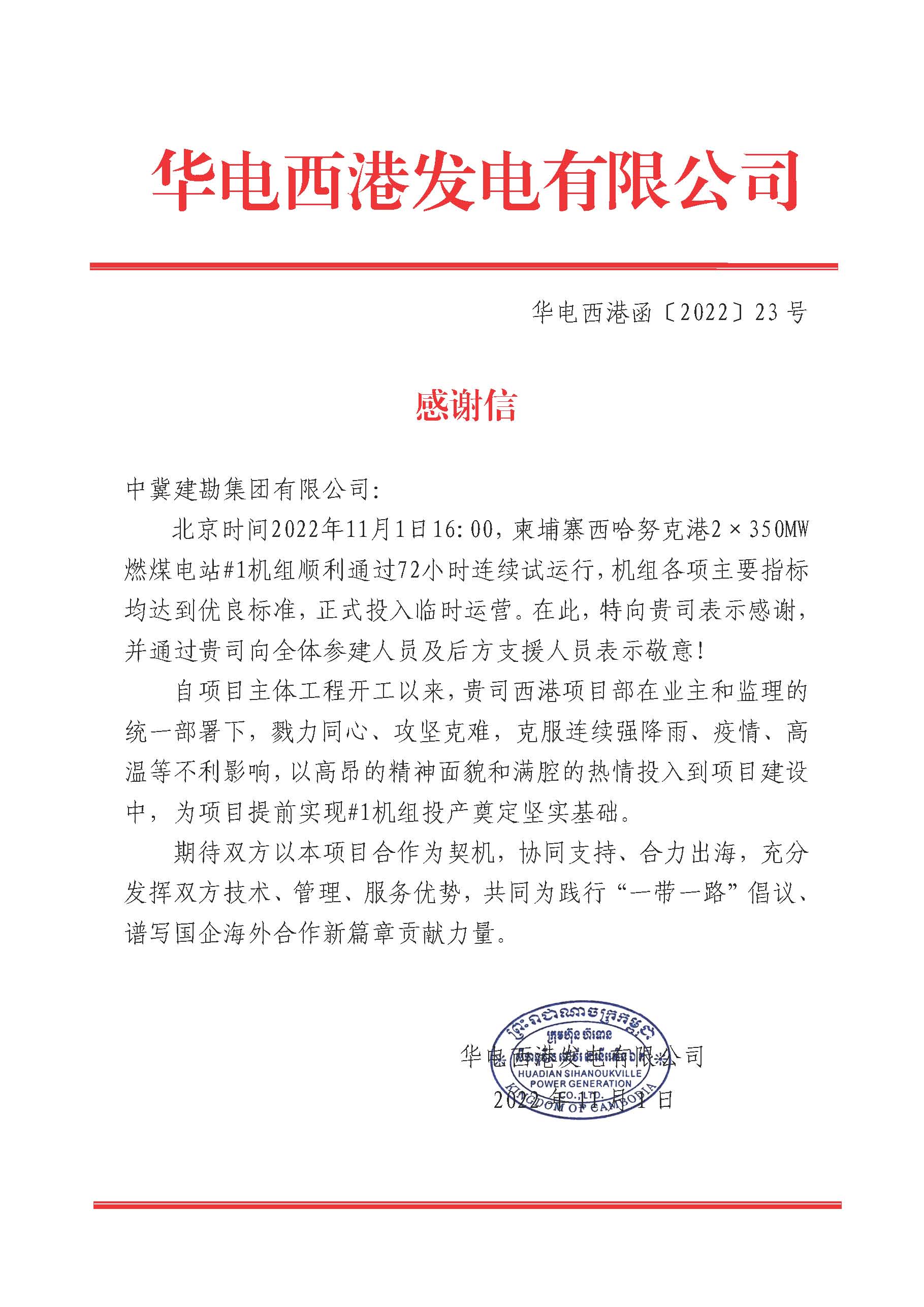 北京時(shí)間2022年11月1日16:00,由我公司承建的柬埔寨西哈努克港2×350MW燃煤電站#1機(jī)組順利通過(guò)柬埔寨國(guó)家電力公司要求的滿負(fù)荷性能試驗(yàn),標(biāo)志著中國(guó)華電在柬投資興建的最大火電項(xiàng)目首臺(tái)機(jī)組正式投產(chǎn)發(fā)電。該項(xiàng)目是中國(guó)華電在“一帶一路”沿線國(guó)家投資建設(shè)的重點(diǎn)工程,也是目前中國(guó)在柬單體投資最大電源項(xiàng)目。業(yè)主華電西港發(fā)電有限公司特向我公司表示感謝,并對(duì)我公司全體參建人員及后方支持人員表示敬意!