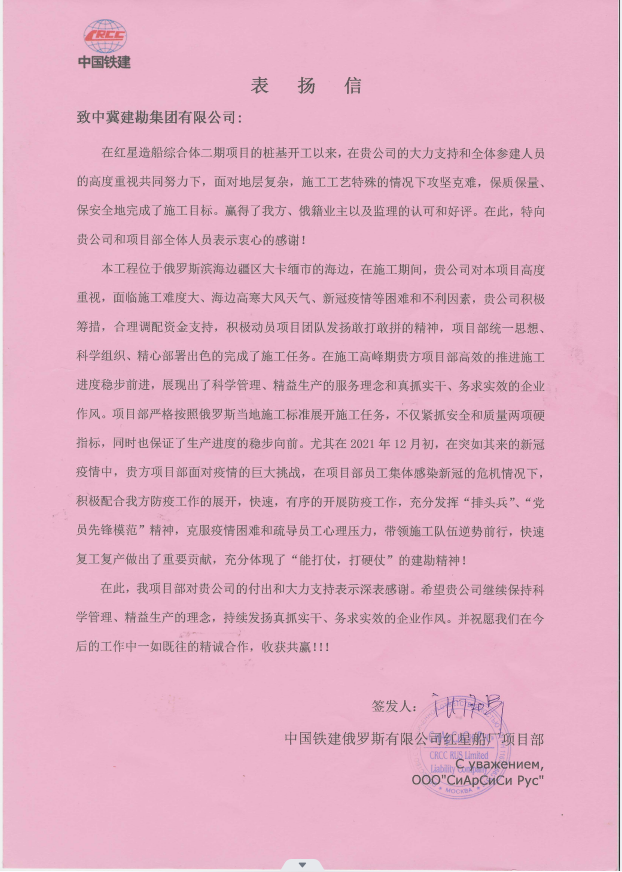 俄羅斯海參崴紅星造船綜合體(二期)項(xiàng)目,收到中國鐵建俄羅斯紅星船廠項(xiàng)目部的表揚(yáng)信,施工期間,在項(xiàng)目領(lǐng)導(dǎo)的帶領(lǐng)下,項(xiàng)目部統(tǒng)一思想、科學(xué)組織,經(jīng)過305天的奮戰(zhàn),項(xiàng)目部完成了質(zhì)量安全零事故,保質(zhì)保量促進(jìn)生產(chǎn)的任務(wù)目標(biāo)。我公司負(fù)責(zé)的302、303、304廠房樁基檢測驗(yàn)收全部合格。在施工高峰期克服了 新冠疫情、高寒天氣、俄烏戰(zhàn)爭影響等諸多困難和不利因素,采取24小時(shí)不間斷施工,積極調(diào)配合理高效的推進(jìn)施工進(jìn)度穩(wěn)步前進(jìn)。尤其在突如其來的新冠疫情中,項(xiàng)目部面對疫情的巨大挑戰(zhàn),積極采取措施,配合防疫工作的展開,快速,有序的開展隔離工作,安撫感染人員恐慌情緒。這種科學(xué)防疫、積極組織為后期快速復(fù)工復(fù)產(chǎn)做出了重要貢獻(xiàn),得到了總包單位的充分肯定和表揚(yáng)。