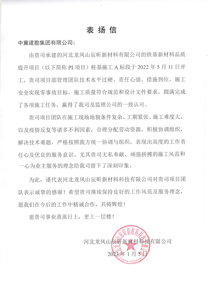 我公司華能甘肅正寧電廠二期工程項(xiàng)目部收到業(yè)主方華能隴東能源公司正寧電廠發(fā)來的表揚(yáng)信,施工期間,在項(xiàng)目領(lǐng)導(dǎo)的帶領(lǐng)下,憑借出色的業(yè)務(wù)水平、深厚的施工經(jīng)驗(yàn)在業(yè)主、監(jiān)理及設(shè)計(jì)方中間起到了良好的溝通橋梁作用。本工程的創(chuàng)優(yōu)目標(biāo)為“國家優(yōu)質(zhì)工程金獎(jiǎng)”,我單位負(fù)責(zé)的B標(biāo)段樁基檢測驗(yàn)收I類樁比例高于創(chuàng)優(yōu)標(biāo)準(zhǔn)。在新一輪新冠疫情沖擊下,項(xiàng)目部嚴(yán)格執(zhí)行疫情防控措施,工程建設(shè)工作和防疫工作兩不誤表現(xiàn)出了建勘人高度的工作責(zé)任心及優(yōu)良的服務(wù)意識,贏得了華能隴東能源公司領(lǐng)導(dǎo)及員工的充分肯定。