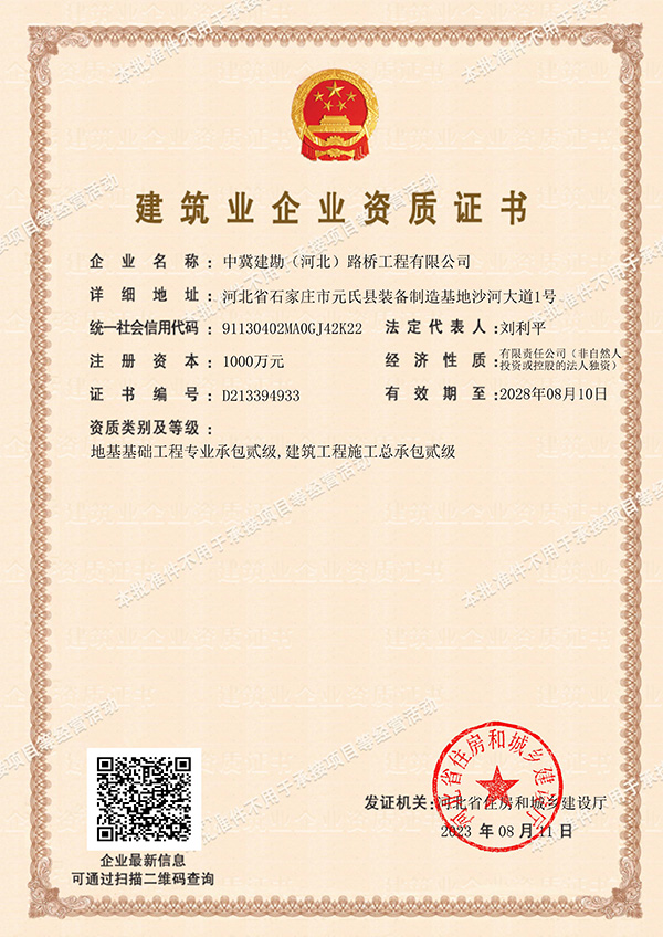2023年8月11日,經(jīng)河北省住房和城鄉(xiāng)建設(shè)廳審批,中冀建勘(河北)路橋工程有限公司順利取得了建筑工程施工總承包貳級、地基基礎(chǔ)工程專業(yè)承包貳級資質(zhì)。