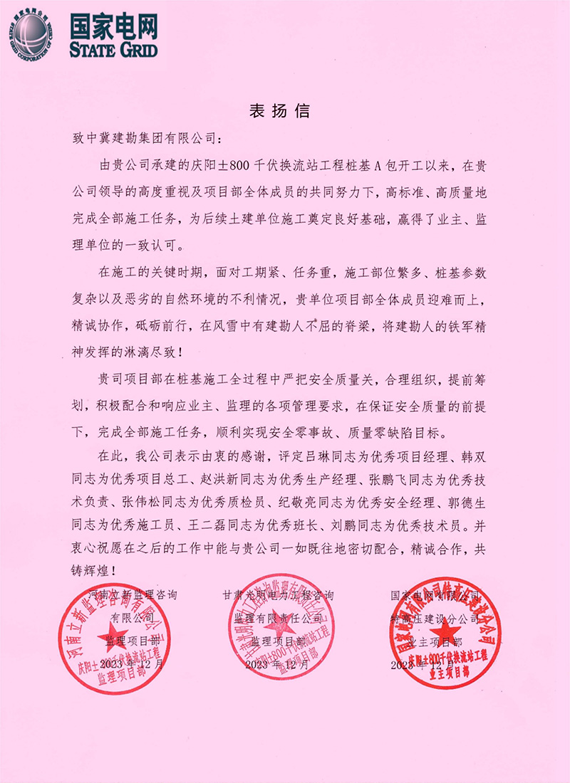 公司收到了國家電網(wǎng)慶陽±800千伏換流站工程由業(yè)主國家電網(wǎng)和監(jiān)理單位河南立新及甘肅光明的聯(lián)合表揚信,表揚信中說在我公司領導的高度重視及項目部全體成員的共同努力下,高標準、高質量地完成施工任務,為后續(xù)土建單位施工奠定良好基礎,贏得了業(yè)主、監(jiān)理單位的一致認可。在施工的關鍵時期,我單位項目部全體成員迎難而上,精誠協(xié)作,砥礪前行,在風雪中有建勘人不屈的脊梁,將建勘人的鐵軍精神發(fā)揮的淋漓盡致!