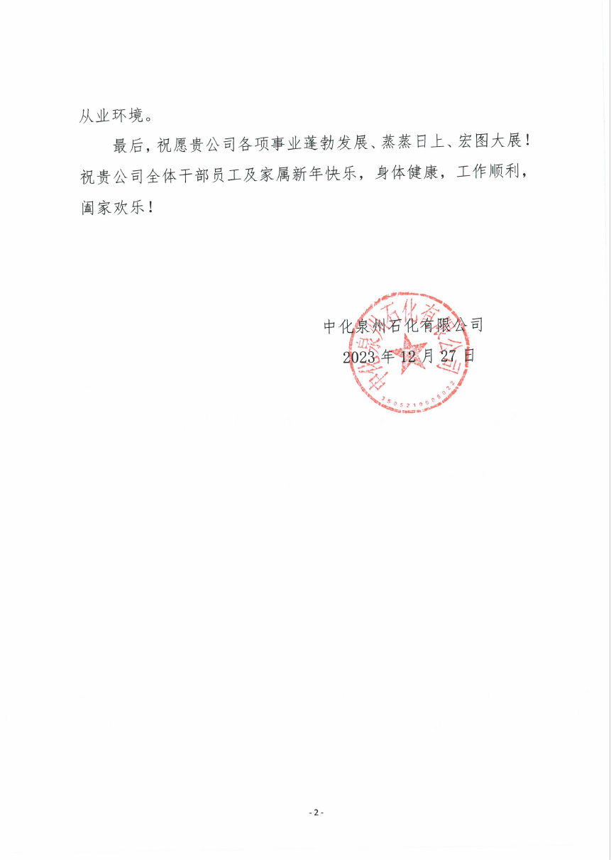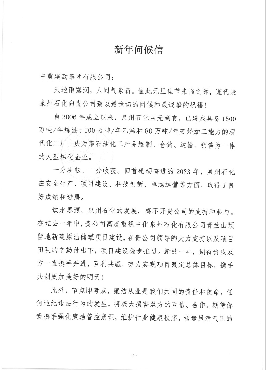 中化泉州石化有限公司為我公司發(fā)來了新年問候信,信中中化泉州石化有限公司肯定了我公司對中化泉州石化有限公司青蘭山預留地新建原油儲罐項目建設的重視;看到了我公司及項目施工人員為項目的辛勤付出;并期望在新的一年里加強合作,再創(chuàng)新業(yè)績。