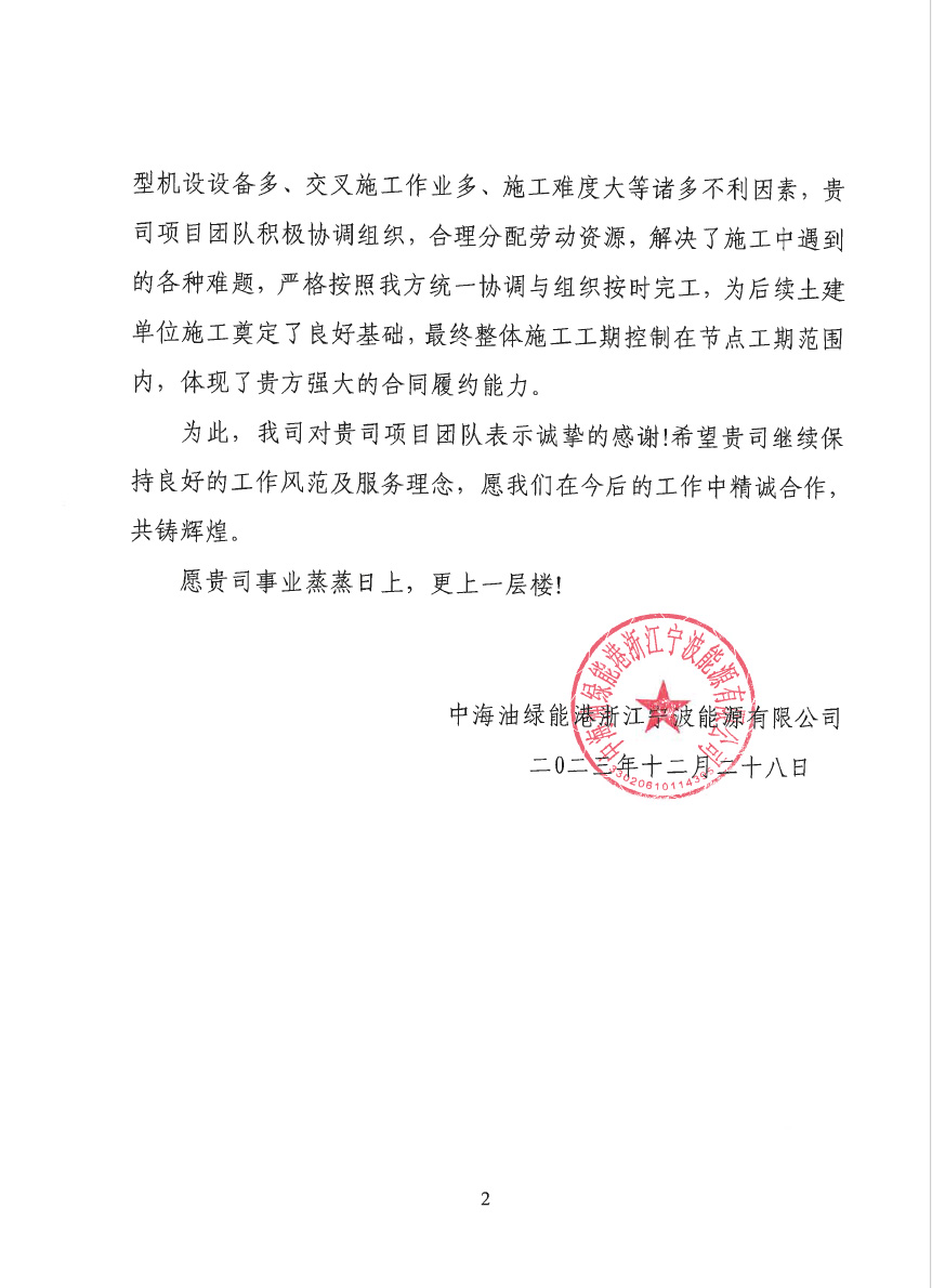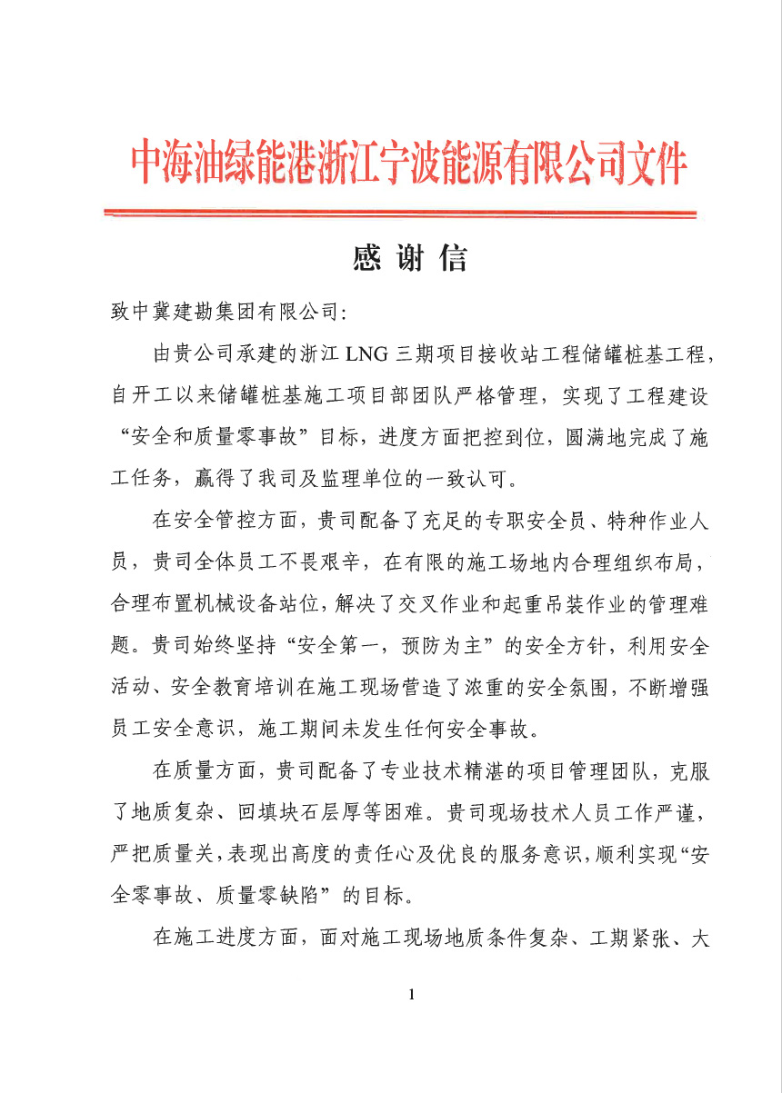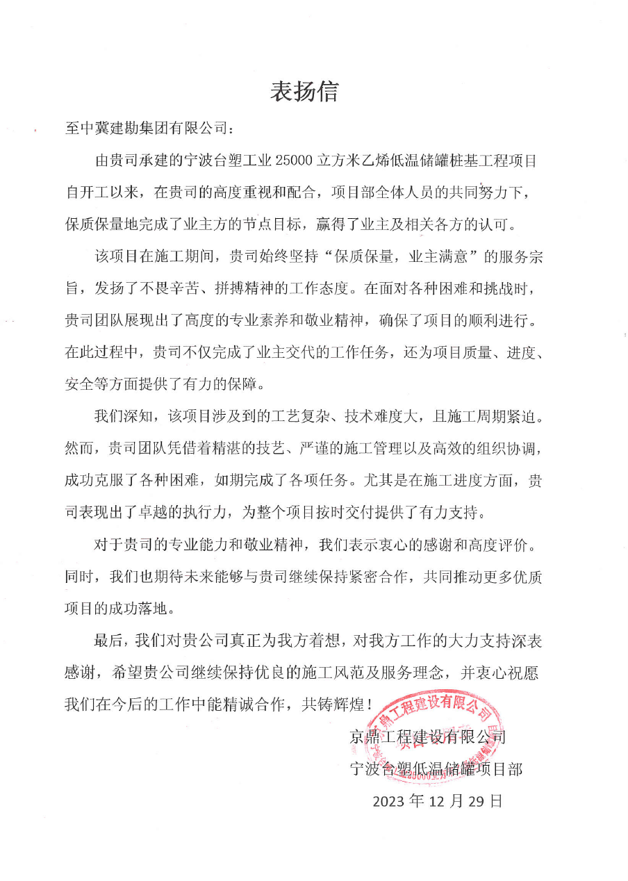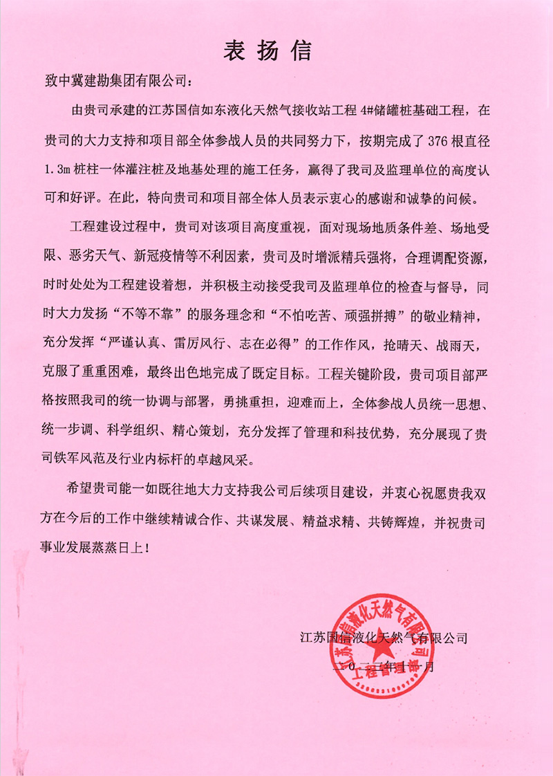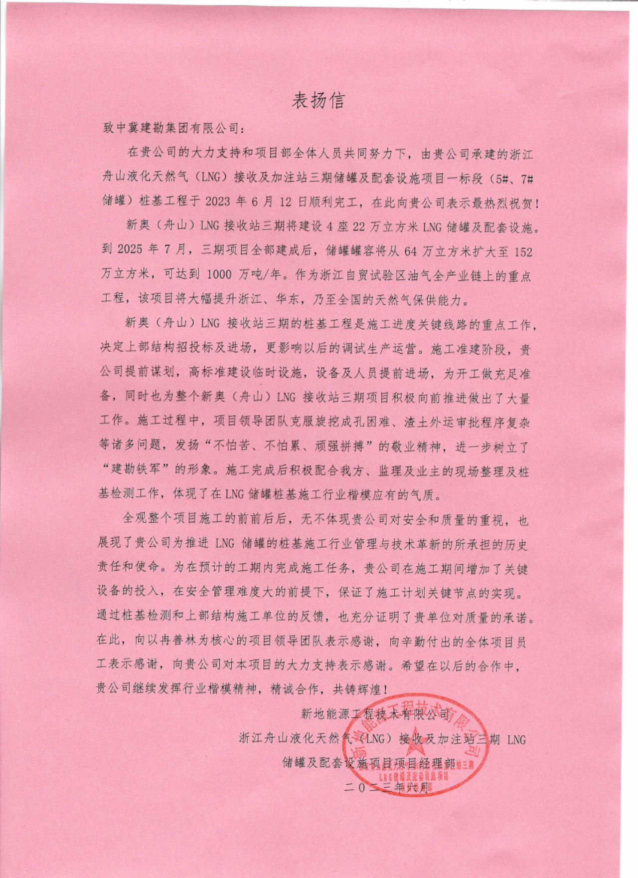 浙江舟山液化天然氣(LNG)接收及加注站三期LNG儲罐及配套設施項目(5#、7#儲罐樁基工程)于2023年6月25日收到新地能源工程技術有限公司發(fā)來的表揚信。自開工以來,在公司的大力支持和項目部全體員工的共同努力下,精心組織、全力布局,克服了前期施工任務重等諸多困難,安全、高效、優(yōu)質的完成了儲罐的樁基施工任務,有力保障了本項目總體工期計劃,贏得了監(jiān)理單位和業(yè)主單位的一致認可和好評。