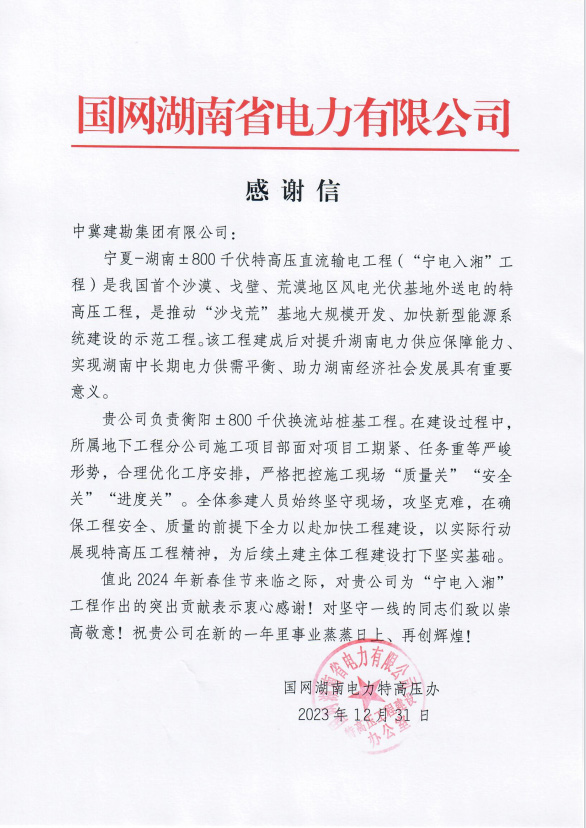 國家電網(wǎng)湖南電力特高壓辦,為我公司承建的衡陽±800千伏換流站工程樁基項目部發(fā)來感謝信一封。感謝信內容主要表達了,面對項目的工期緊,任務重等關鍵形勢,稱贊我公司能嚴格把質量關,安全關和進度關。