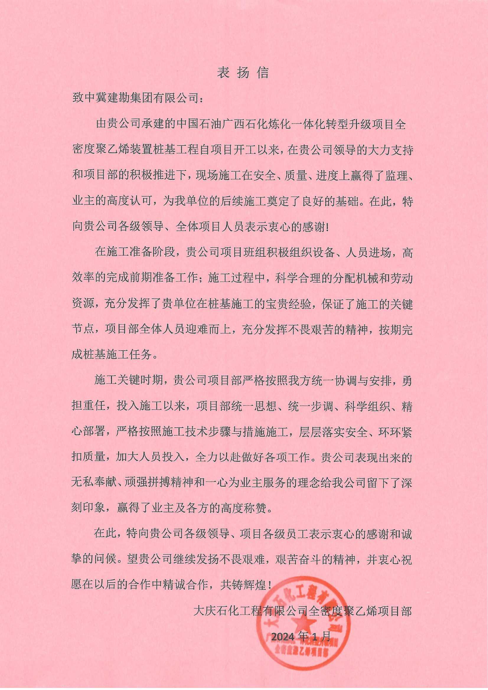 廣西石化煉化項目部接收到大慶石化工程有限公司全密度聚乙烯工程建設部項目經(jīng)理牛家偉發(fā)來的表揚信,信中肯定了我項目部在廣西石化煉化項目樁基工程中所取得的成果。