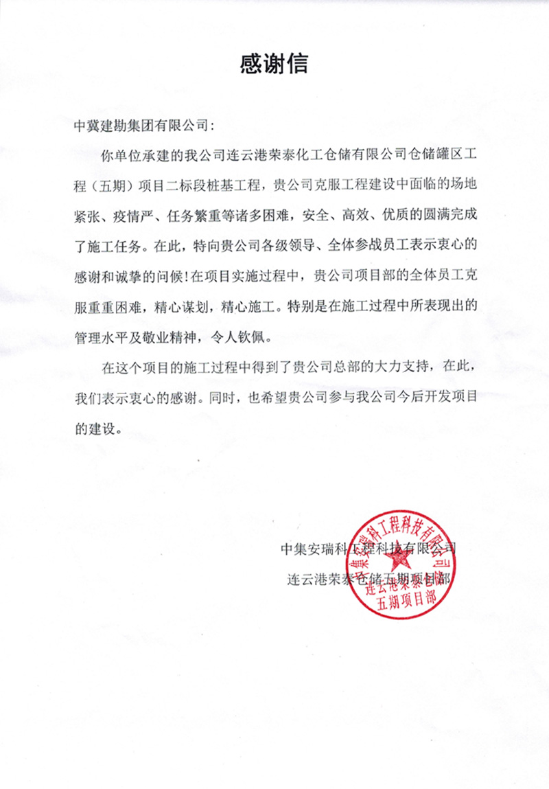 連云港榮泰化工倉儲有限公司倉儲罐區(qū)工程(五期)項目二標段樁基工程,業(yè)主在表揚信中說:貴公司克服工程建設中面臨的場地緊張、疫情嚴、任務繁重等諸多困難,安全、高效、優(yōu)質的圓滿完成了施工任務。貴公司項目部全體員工克服重重困難,精心謀劃,精心施工。特別是在施工中所表現(xiàn)出的管理水平及敬業(yè)精神,令人欽佩。