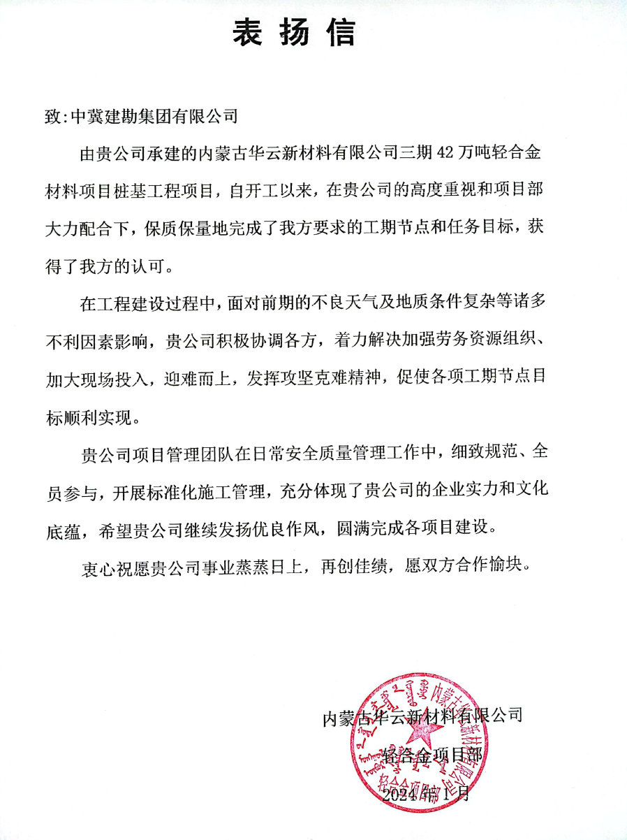內蒙古華云新材料有限公司三期42萬噸輕合金材料項目樁基工程,在工程建設過程中,面對前期的不良天氣及地質條件復雜等諸多不利因素影響,積極協(xié)調各方,著力解決加強勞務資源組織、加大現(xiàn)場投入,迎難而上,發(fā)揮攻堅克難精神,保質保量地完成了工期節(jié)點和任務目標,獲得甲方的認可。