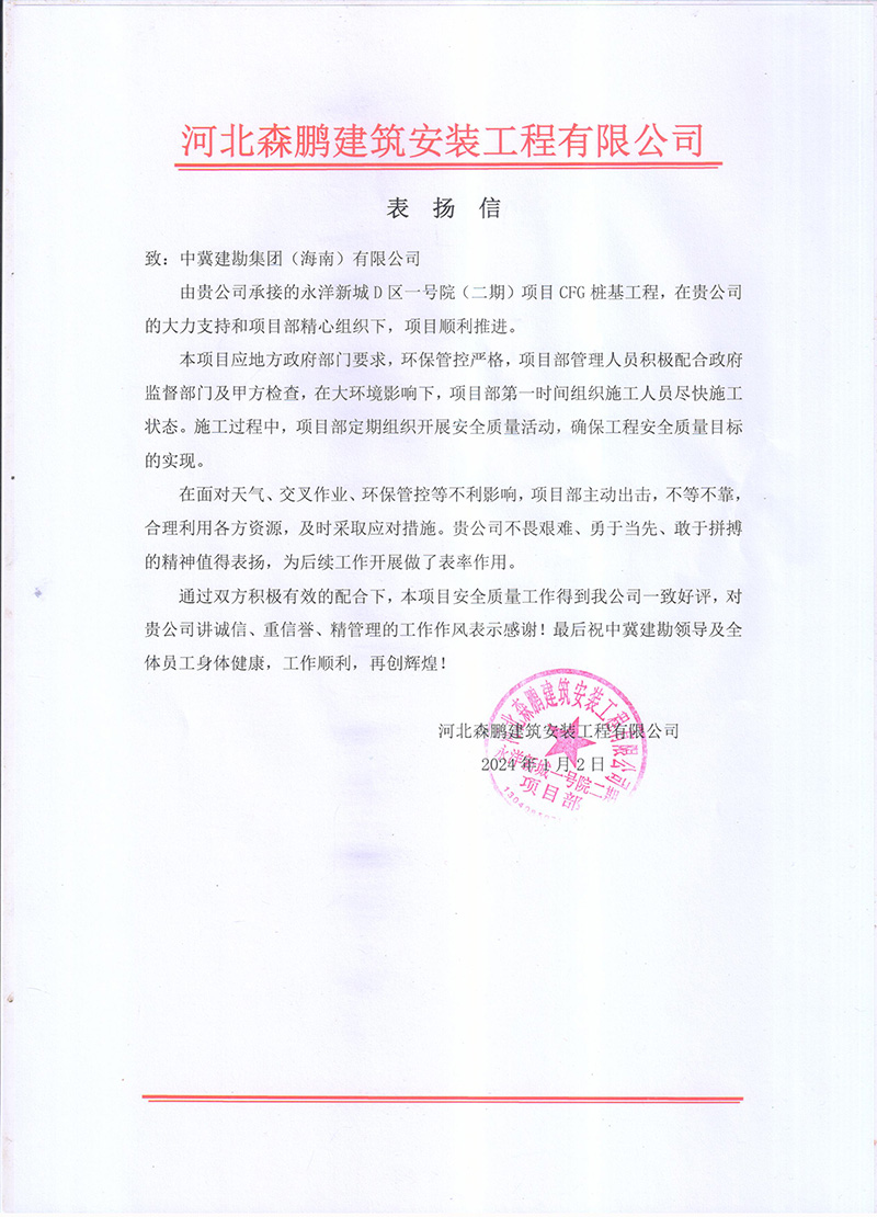 廣西北海氧化鋁項目樁基工程工程自2023年2月24日開工,至12月15日完成合同內全部樁基施工任務,在此期間,項目部全體成員一直堅持安全第一的理念,實現(xiàn)了工程建設“零缺陷、零傷害、零事故、零污染”的安全管理目標,施工過程中克服種種困難,順利實現(xiàn)了業(yè)主方制定的節(jié)點目標,獲得業(yè)主單位的肯定與褒獎,送出表揚信,為主要管理人員頒發(fā)獎狀。為后續(xù)施工工作的開展提供了可靠保障,贏得了業(yè)主及相關各方的認可。