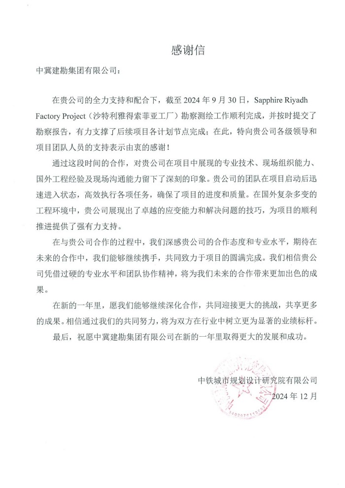 中鐵城市規(guī)劃設(shè)計(jì)研究院有限公司發(fā)來(lái)表?yè)P(yáng)信,對(duì)在我公司全力支持和配合下,順利完成沙特利亞德索菲亞工廠勘察測(cè)繪工作,并按時(shí)提交了勘察報(bào)告,有力支撐了后續(xù)項(xiàng)目各計(jì)劃節(jié)點(diǎn)完成,向我公司及項(xiàng)目團(tuán)隊(duì)表示由衷感謝。