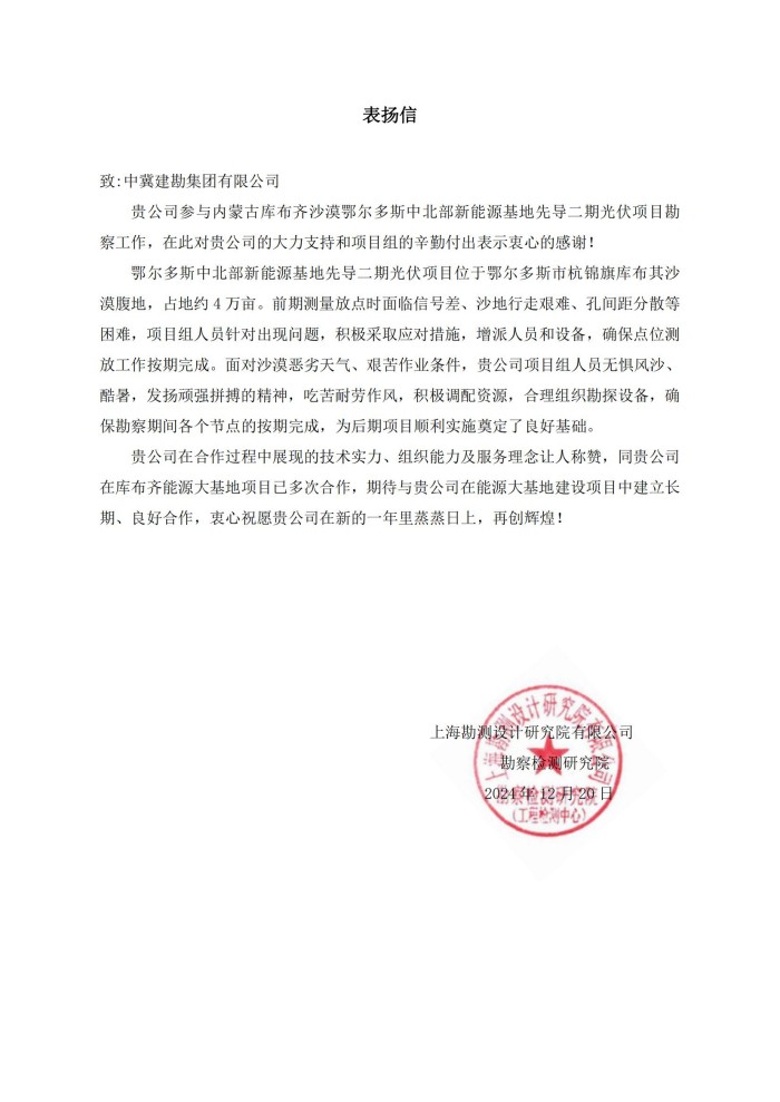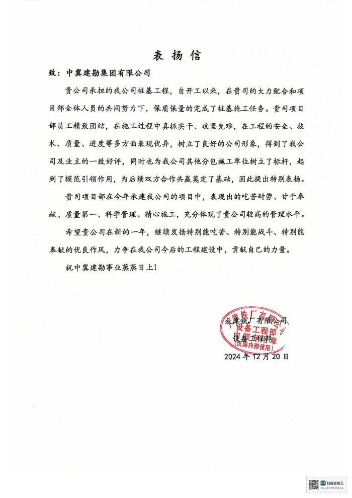 此外,我公司參與的新疆農(nóng)六師鋁業(yè)CFG樁項(xiàng)目、內(nèi)蒙古庫(kù)布齊沙漠鄂爾多斯中北部新能源基地光伏項(xiàng)目、深能保定西北郊熱電廠樁基礎(chǔ)工程等多個(gè)國(guó)內(nèi)外項(xiàng)目收到業(yè)主單位表?yè)P(yáng)信,對(duì)我公司在項(xiàng)目中的高效執(zhí)行、嚴(yán)謹(jǐn)管理和出色的團(tuán)隊(duì)協(xié)作表示衷心感謝,并希望未來(lái)繼續(xù)與我公司保持緊密合作。
