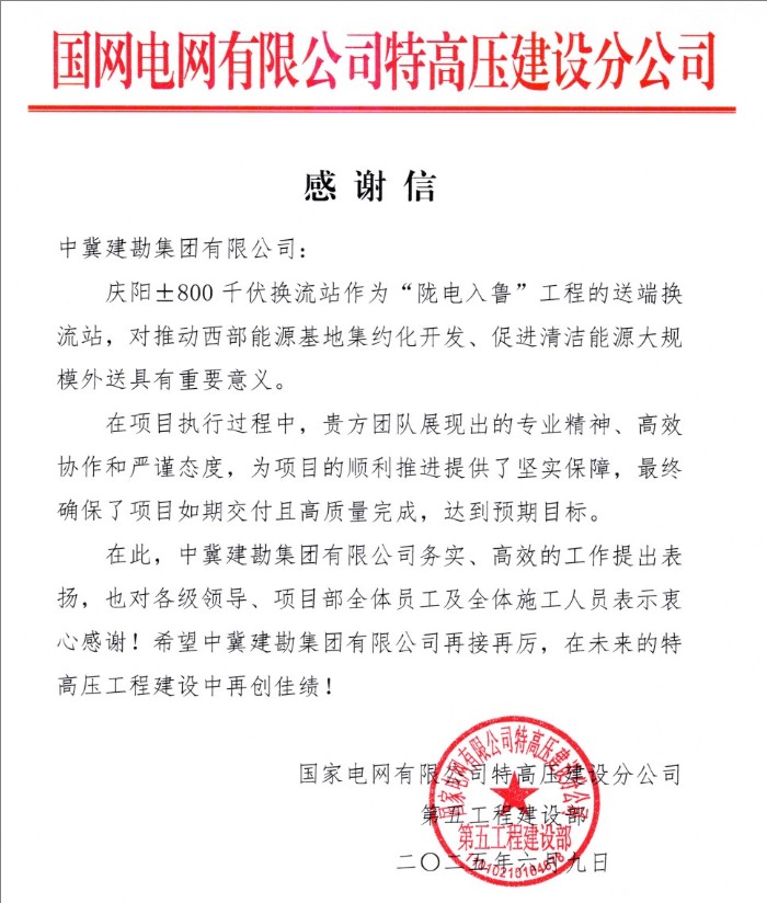 2025年6月9日,在±800千伏隴東-山東特高壓直流工程(簡稱“隴電入魯”)正式投運之際,我公司收到國家電網(wǎng)有限公司特高壓建設(shè)分公司對慶陽±800千伏換流站項目發(fā)來的感謝信。信中高度贊揚了我公司在項目執(zhí)行過程中展現(xiàn)出的卓越專業(yè)精神、高效協(xié)作能力和嚴(yán)謹(jǐn)工作態(tài)度。