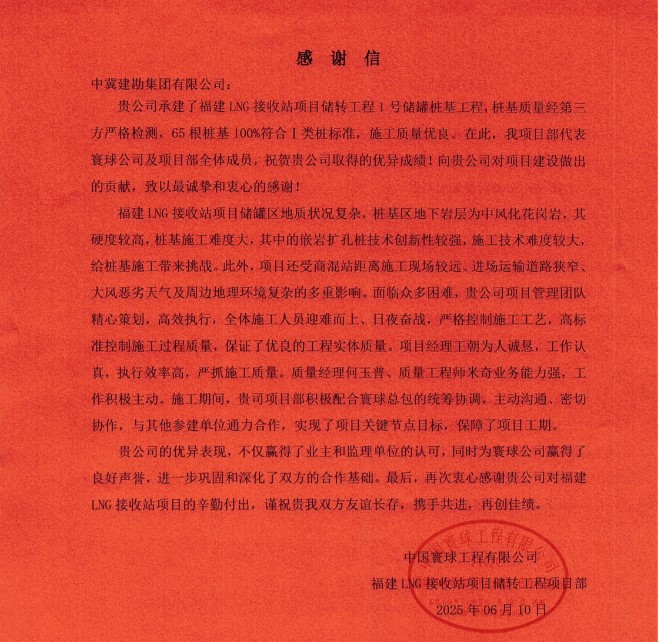 2025年6月12日,我公司收到中國(guó)寰球福建LNG接收站項(xiàng)目?jī)?chǔ)轉(zhuǎn)工程項(xiàng)目發(fā)來(lái)的感謝信。信中高度贊揚(yáng)了我公司在項(xiàng)目執(zhí)行過(guò)程中展現(xiàn)出的項(xiàng)目高效的團(tuán)隊(duì)管理、精心策劃、高效執(zhí)行。