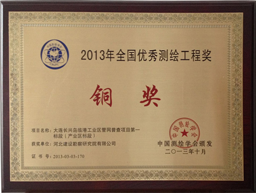 近日,由我公司完成的大連長興島臨港工業(yè)區(qū)管網(wǎng)普查項(xiàng)目第一標(biāo)段(產(chǎn)業(yè)區(qū)標(biāo)段)被中國測繪學(xué)會(huì)評(píng)為優(yōu)秀測繪工程銅獎(jiǎng)。